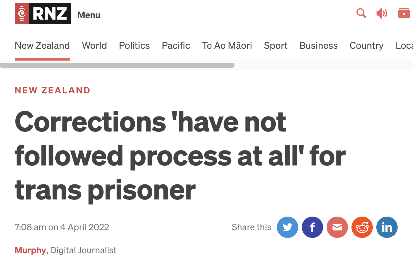 Murphy. (2022, April 4). Corrections “have not followed process at all” for trans prisoner. RNZ. https://www.rnz.co.nz/news/national/464580/corrections-have-not-followed-process-at-all-for-trans-prisoner