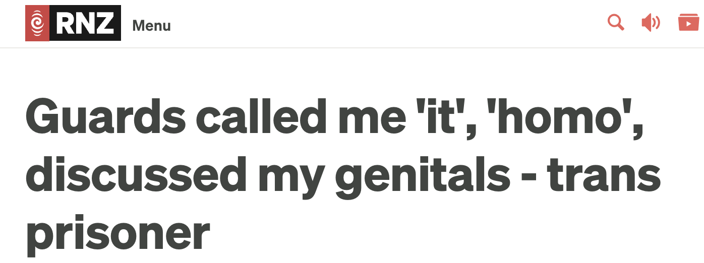 Murphy. (2024, May 9). Guards called me “it”, “homo”, discussed my genitals - trans prisoner. RNZ. https://www.rnz.co.nz/programmes/here-we-are/story/2018773312/guards-called-me-it-homo-discussed-my-genitals-trans-prisoner