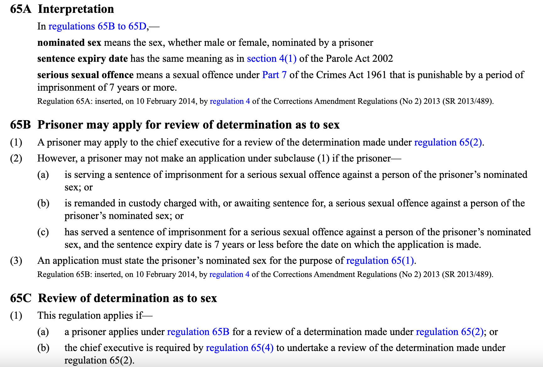 The Corrections Regulations 2005 Outlines transgender prisoner's ability to choose their nominated gender and what prison (men's or women's) they are sent to.