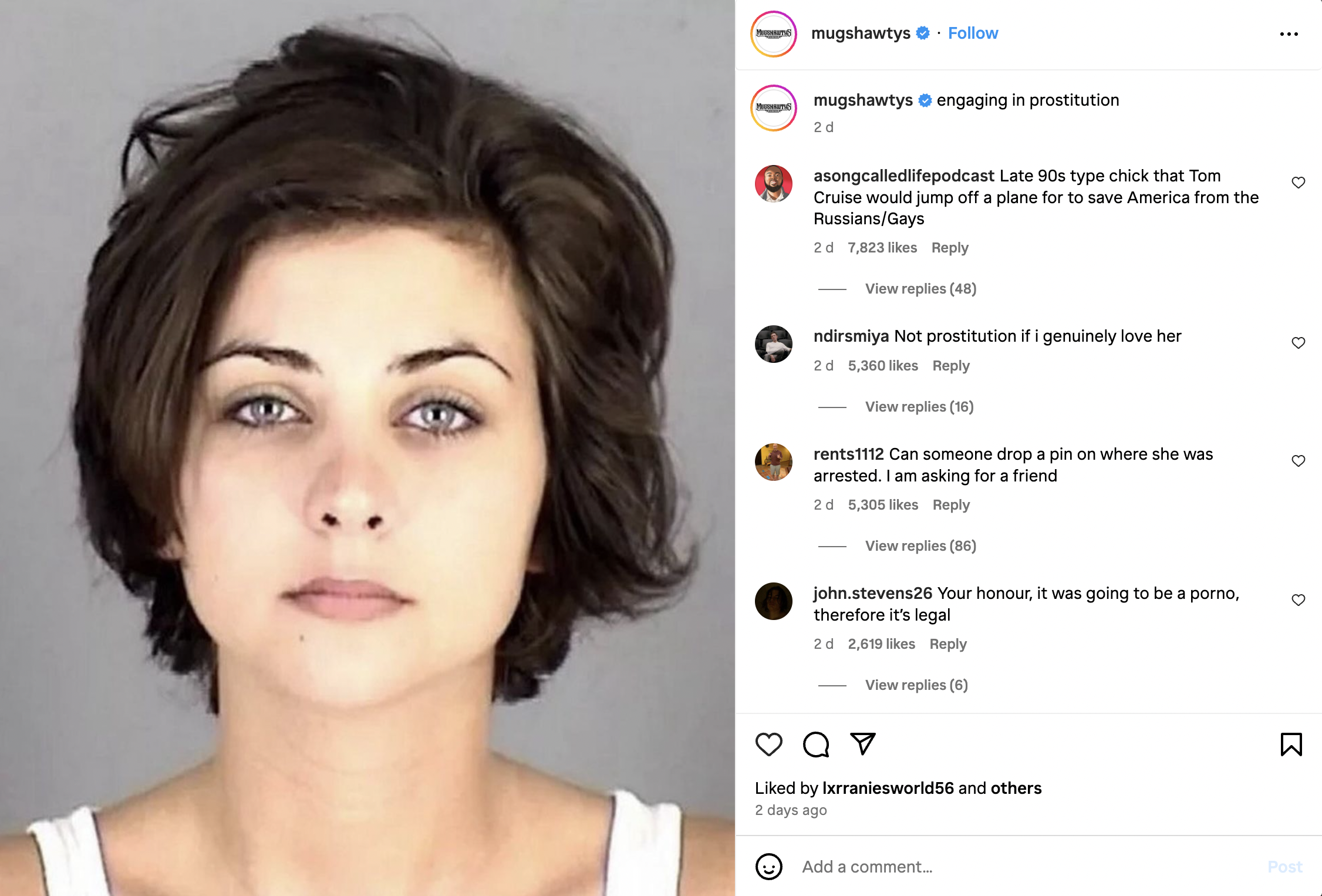 Moreover, this is an example Instagram post from the Mugshawty's account presenting a mugshot of a woman arrested for engaging in prostitution. This is also an example of the male gaze at play where prostitution as a form of labour is disregarded within the interest of sex rather than validating women and minimising instances of harm. The comments discussed under this Instagram post tend to invalidate feminist movements within the progress for social change and sexualises these women as objects of desire.