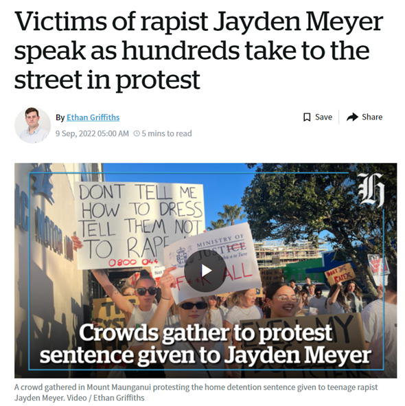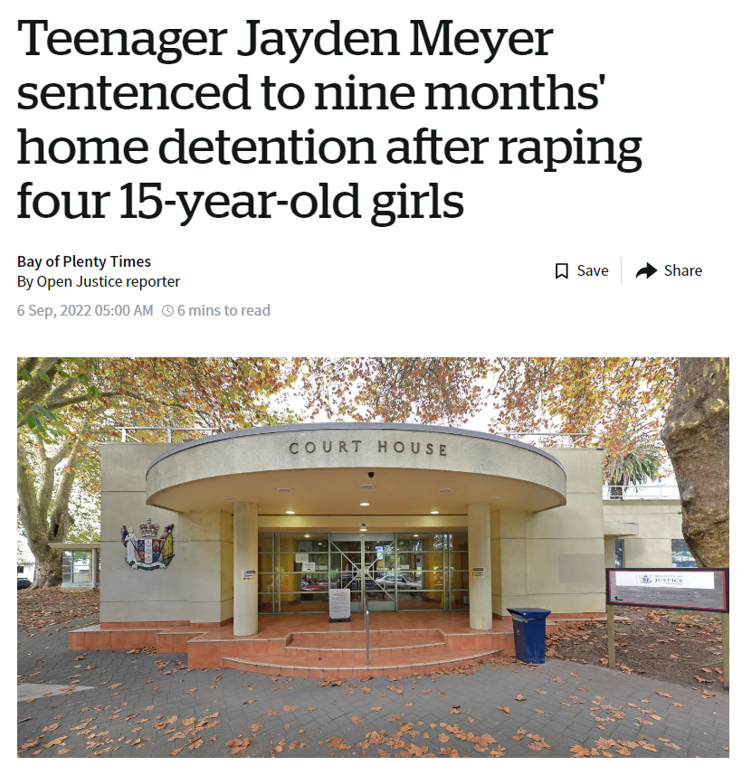 An example of this can be seen in a recent case witnessing Jayden Meyer walking away from court with 9-month home detention and a further 12 month of post-release conditions, including a ban on associating with anyone under 16 and attending a sexual violence prevention programme. Meyer faced ten charges, four of which were rape, another four for sexual violation and two for committing indecent acts.